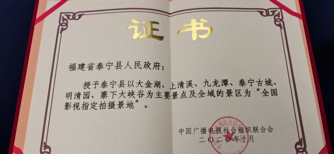 2020年10月20日,由國家廣電總局、福建省人民政府指導,中國廣播電視社會組織聯合會、中國電視制片人協會、福建省廣播電視局、省電影局、中共廈門市委宣傳部主辦的“首屆電視制片大會暨第三屆影視基地峰會”在廈門集美湖豪生大酒店開幕。 開幕式上,泰寧縣作為本次授牌的兩個基地之一,以大金湖、上清溪、九龍潭、泰寧古城、明清園、寨下大峽谷為主要景點及全域的景區被中國廣播電視社會組織聯合會授予“全國影視指定拍攝景地”,中廣聯合會電視制片委員會會長張明智授牌,泰寧縣委副書記廖晶波代表泰寧縣委、縣政府接受授牌。本次大會還將安排泰寧影視基地資源推介以及為期3天的全國電視劇名家泰寧故事采風活動。采風期間,泰寧縣還將舉辦福建(泰寧)影視基地開園暨全國影視指定拍攝景地揭牌儀式。
