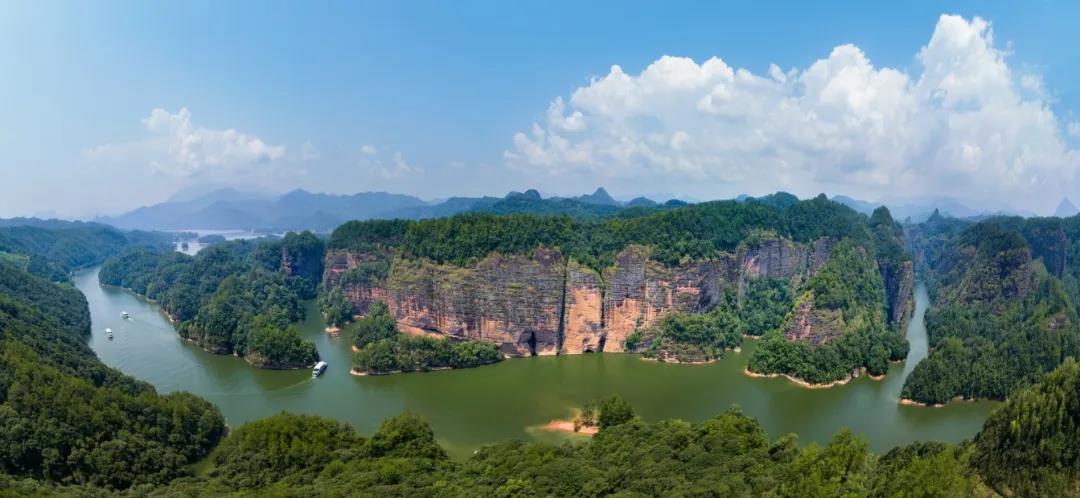 金湖距離縣城 8 公里,區內景觀資源十分豐富,具有山青、水秀、石美、洞奇、峰怪“五絕”特點。湖水映襯山峰的雄奇,山峰烘托湖水的深邃,加之鑲嵌于沿岸的巖寺古剎、漁村山寨、古墓關隘等眾多人文景觀,曲折多致,景象萬千,充滿山水靈性。造就了國內罕見的水上丹霞奇觀,中國當代學者蔡尚思稱之為“天下第一湖山”,適合現代劇、仙俠劇等類型的影視劇外景拍攝。