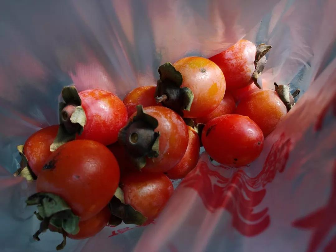 野柿子個頭不大,紅而飽滿,果皮吹彈可破。野柿子不能像電視劇里的火晶柿子那般用根小管就能吸溜完,畢竟最好吃的脆脆彈彈柿子瓤部分沒辦法穿過小管子。柿子瓤才是柿子的精髓所在。摘掉四瓣花一樣的果蒂,嘴對上去猛吸,果瓤和汁水一般的果漿便涌進口腔,簡直甜到心坎。