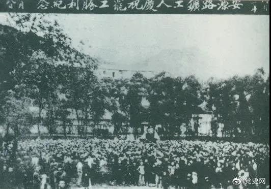 1922年9月14日-18日 安源路礦工人在毛澤東、李立三、劉少奇等組織領導下,舉行罷工斗爭,取得勝利。圖為安源路礦工人慶祝罷工勝利。 審核:肖劍光 |