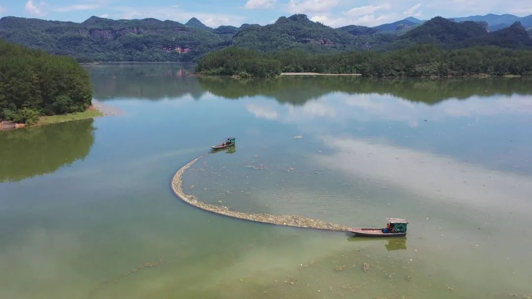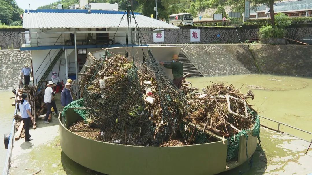 每年的雨季,是大金湖水位最高的時候,為游客提供全程游覽體驗的同時,也給景區管理帶來了難題。由于前段時間連續的強降雨,上游的河段岸邊的垃圾、枯枝樹木被洪水沖進湖內。為了讓游客有個舒適的游覽環境,連日來,景區上足機械、勞力加班加點清理湖面垃圾,確保7月中旬實現全程通航。 福建金泰旅游實業發展有限公司經理范蓉說:我們在金湖景區部臨時組建了一個26人的垃圾清理隊伍,平時每天的工作就是駕駛兩艘大船、四艘掛機在湖面上操作,每天要清理近50噸垃圾。