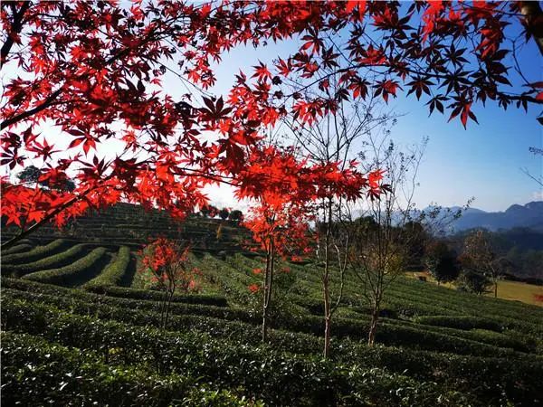 ▲紅楓葉的點綴下的茶山