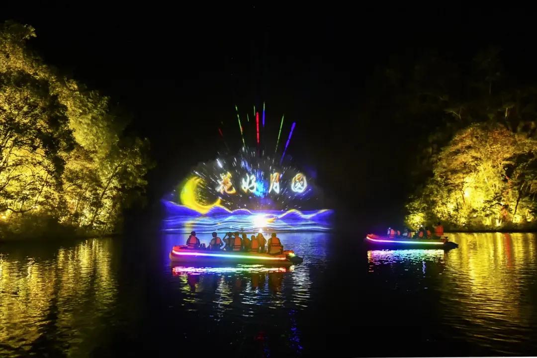 九龍潭夜游 暮色四合時,丹霞群峰化作剪影。水幕光影在潭面流淌,螢火蟲提著燈籠掠過蘆葦蕩,涼風裹挾著蛙鳴,將白晝的喧囂熨燙成靜謐的詩行。
