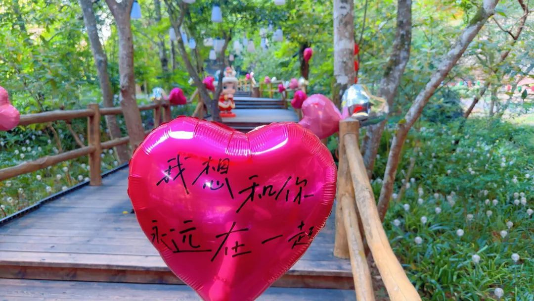 九龍潭景區入口處,設有七夕主題打卡,等你和TA甜蜜同框。入園通道兩側,布滿粉色愛心氣球,仿佛走入童話夢境!還有后花園驚艷亮相,登上“天梯”做彼此“摘月亮”的人~