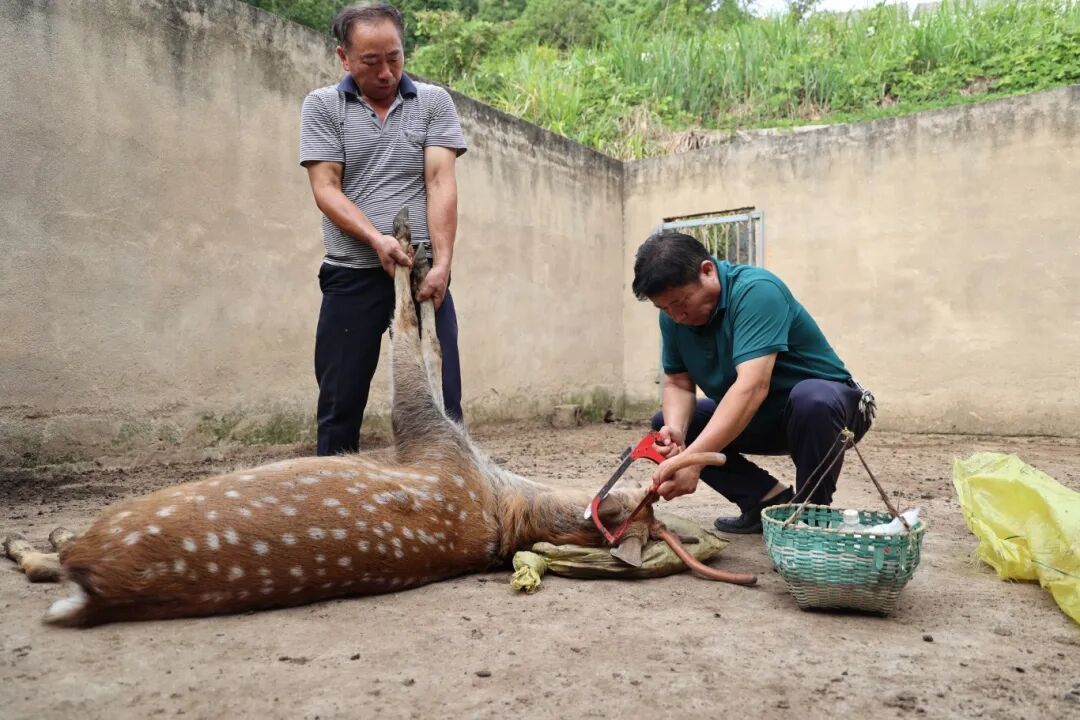 “割鹿茸必須趕在6月至9月,逾期鹿茸就會骨化,藥效和價值都會大打折扣。”廖財應一邊調試獸用麻醉吹針注射器,一邊介紹,“2歲到8歲的公鹿是產茸黃金期,一頭健康公鹿一次能割5斤左右鮮茸,按市場價5000元/斤算,單頭鹿的茸就能帶來2萬多元收入。” 隨著一聲輕微的“咻”聲,麻醉針精準刺入成年公鹿臀部肌肉。10分鐘后,梅花鹿平穩臥倒,廖財應與同事迅速上前固定鹿頭,手鋸起落間,僅用5分鐘便將一對重約4斤的鹿茸完整割下。