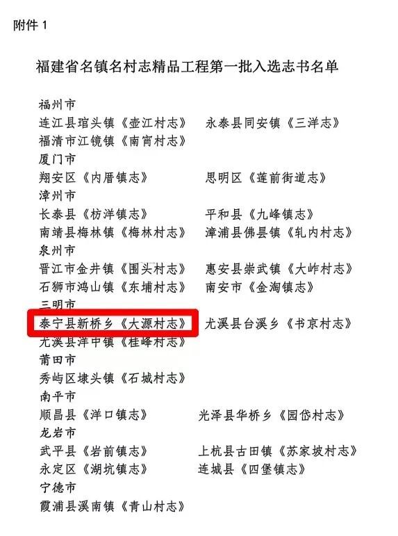 近日,中共福建省委黨史方志辦公布福建省名鎮名村志精品工程第一批志書名單,泰寧縣新橋鄉《大源村志》成功上榜。