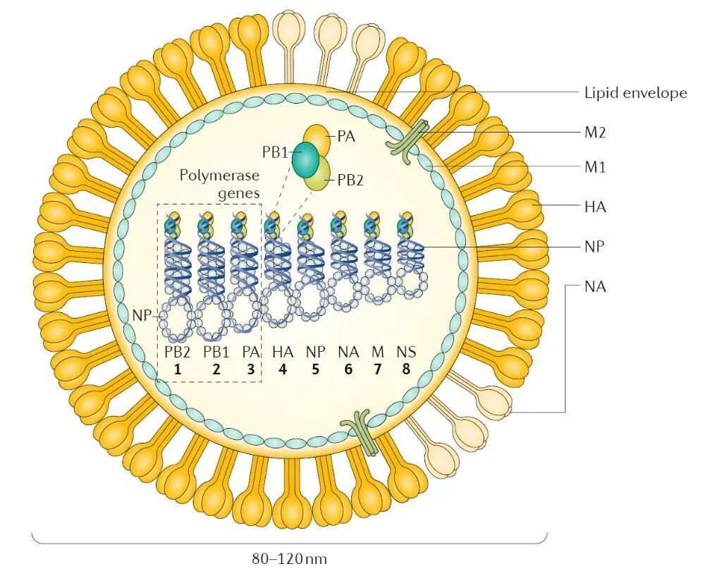(圖源:SOOGIF) “善變”的殺手 流感病毒一般呈球形,直徑為80~120nm,內含7個或8個基因節段,可以分為甲(A)、乙(B)、丙(C)、丁(D)四個型別。 甲型流感病毒容易發生變異,曾經多次引起世界性大流行,如1968年的甲型H3N2大流行和2009年的甲型H1N1大流行。 除了大流行,流感病毒還會造成每年的季節性流行,其中甲型H1N1亞型、H3N2亞型及乙型流感病毒中的Victoria系流感病毒常年在人群中交替或疊加流行。在學校、托幼機構和養老院等人群密集的場所容易發生聚集性疫情。