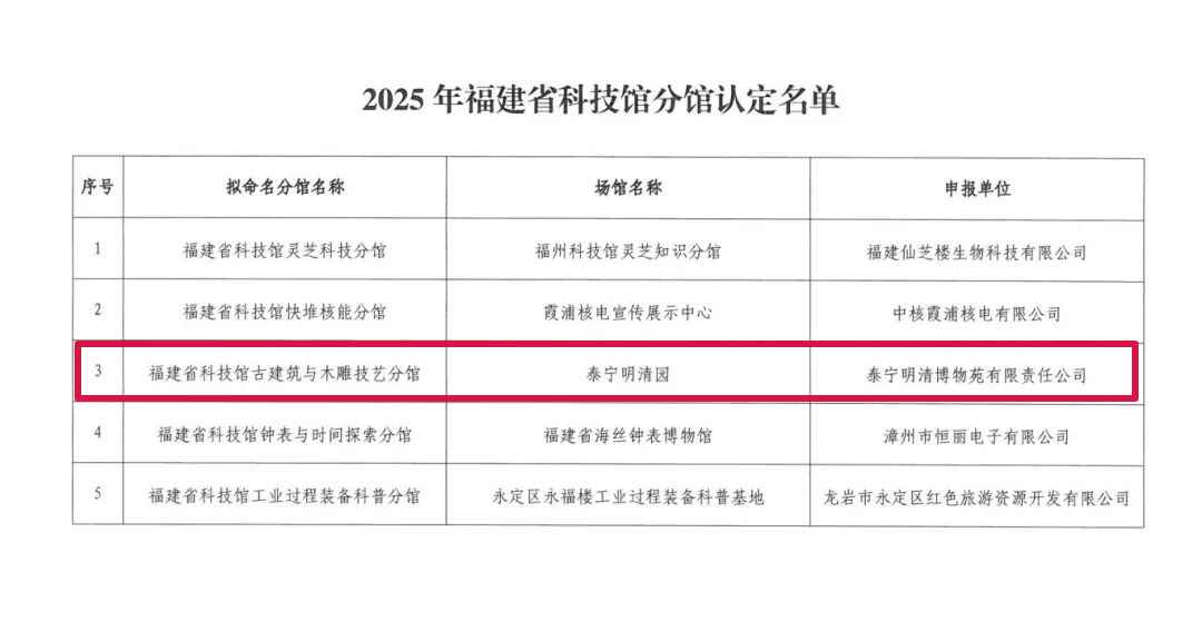 日前, 2025年福建省科技館分館認定名單公布 泰寧明清園 擬命名為 福建省科技館古建筑與木雕技藝分館